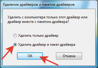 Отмечаем пункт «Удалить драйвер и пакет драйверов».