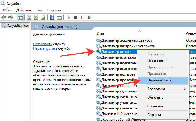 Отмечаем службу «Диспетчер печати» правой кнопкой мыши и в выпадающем списке выбираем пункт «Перезапустить».
