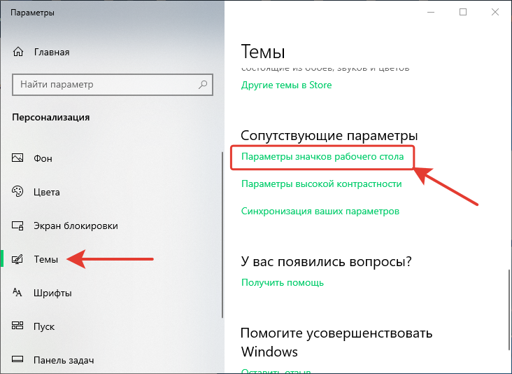 В параметрах персонализации переходим на вкладку «Темы». В правой части окна «Темы» кликаем на пункт «Параметры значков рабочего стола».