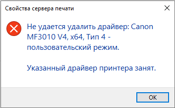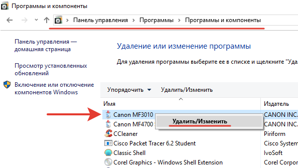 Выбираем нужный принтер, в данном случае Canon MF3010, нажимаем «Удалить/Изменить».