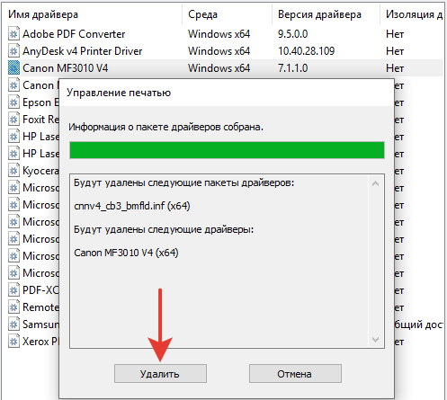 Модели принтеров и диалоговые окна могут быть разные, принцип примерно одинаковый – нажимаем кнопку «Удалить».