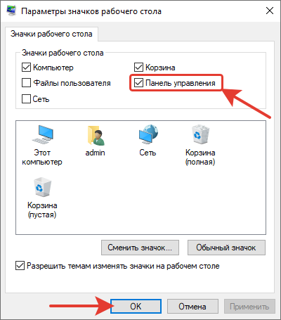 В открывшемся окне отмечаем галочкой пункт «Панель управления».