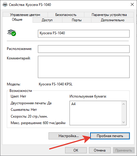 В открывшихся свойствах нажимаем кнопку «Пробная печать».