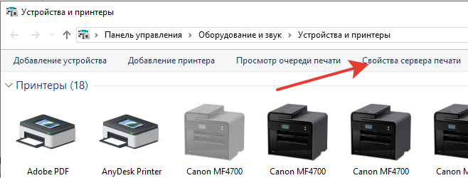Далее, нажимаем мышкой на любой соседний принтер и в верхней панели выбираем «Свойства сервера печати». В открывшемся окне переходим на вкладку «Драйверы».