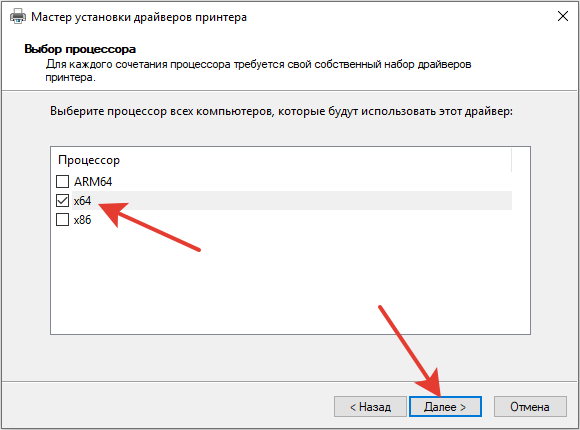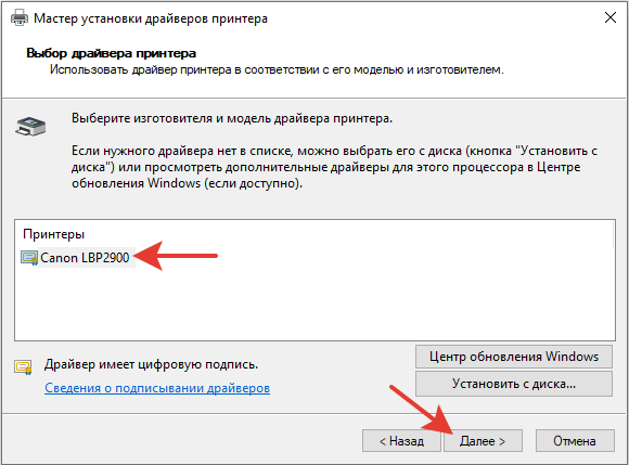 После нажатия кнопки «ОК» нужный принтер появится в списке. Нажимаем «Далее».