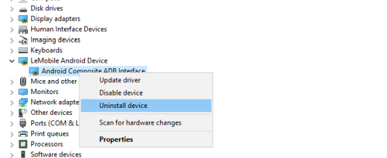 Затем в диспетчере устройств удалите отображаемый в данный момент драйвер Android ADB. Чтобы удалить его, щелкните правой кнопкой мыши категорию, в которой находится ваш телефон — это может быть устройство Android на базе LeMobile , портативные устройства или что-то подобное.