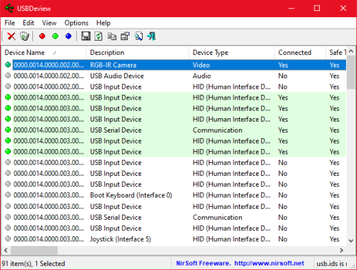 Найдите цветной индикатор состояния в крайнем левом углу окна USBDeview. Есть четыре цвета. Каждый представляет другой статус: