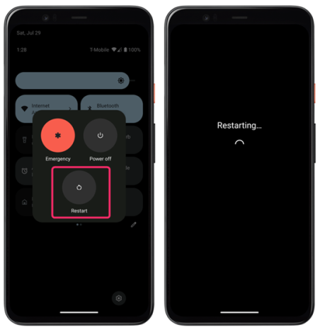 Иногда базовый перезапуск может исправить незначительные программные сбои, вызывающие ошибку «нет SIM-карты» на Android. Чтобы инициировать перезагрузку, нажмите и удерживайте кнопку питания, пока не появится меню с такими параметрами, как «Выключение» и «Перезагрузка». Выберите «Перезагрузить» в меню и подождите, пока телефон завершит процесс перезагрузки: