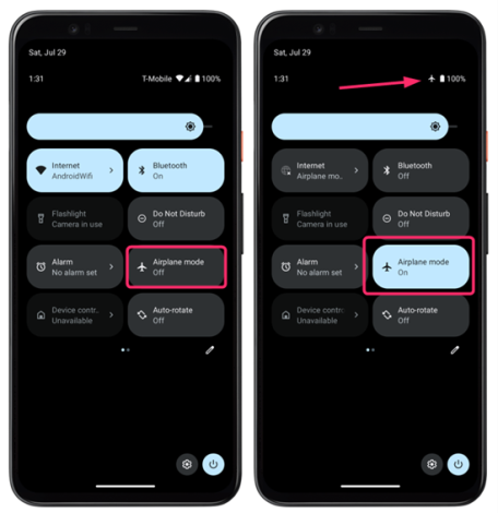 Кроме того, вы также можете попробовать включить и выключить режим полета, чтобы обновить сетевое соединение. Найдите значок режима полета в быстрых настройках и коснитесь его, чтобы включить этот режим. После небольшой паузы коснитесь значка еще раз, чтобы отключить режим полета.