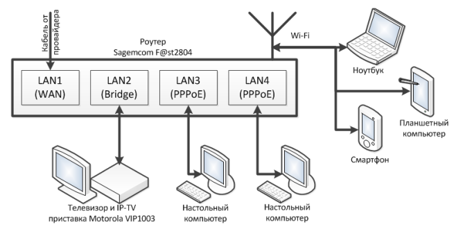 - Порты LAN применяются для подключения ПК, кабель провайдера подключён к разъёму WAN.