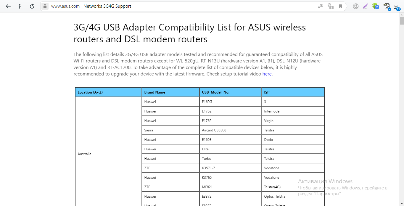 - Asus. В таблице приведены модемы, которые подходят для всех моделей роутеров с USB-выходом, кроме WL-520gU, RT-N13U (аппаратная версия A1, B1), DSL-N12U (аппаратная версия A1) и RT-AC1200.