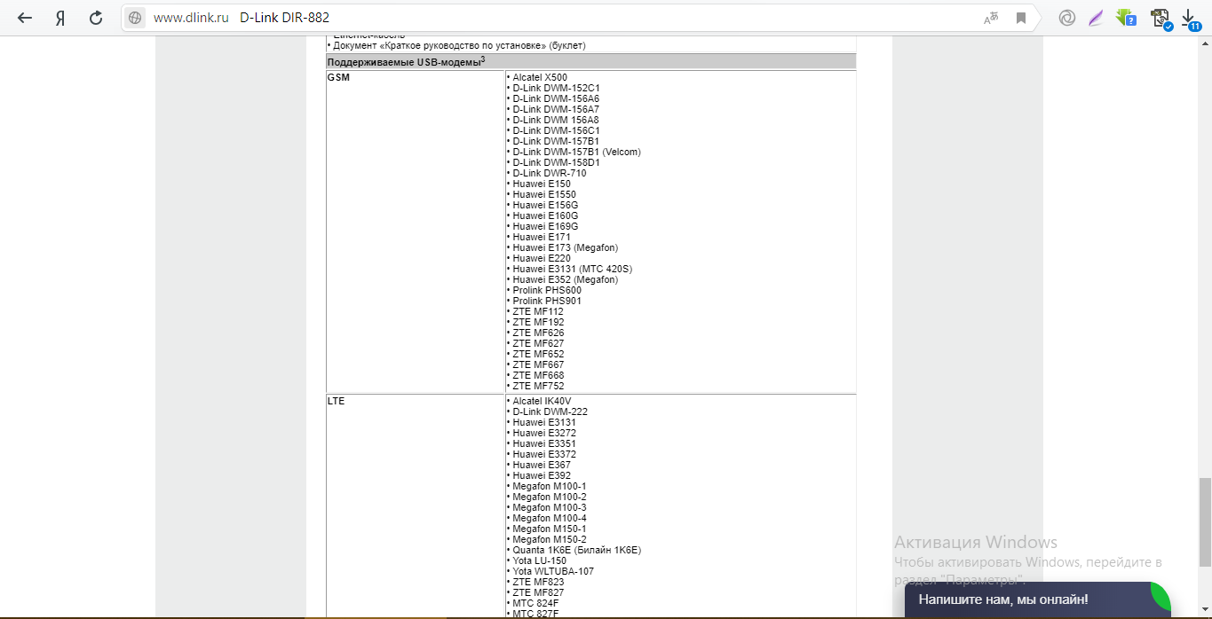 - D-Link. В случае этой компании нужно сначала отыскать страницу с нужной моделью в разделе с роутерами (по ссылке перейдёте сразу в него). Отыщите свою модель, откройте страницу с ним, переключитесь на вкладку «Характеристики». Промотайте таблицу — в самом конце будет список модемов, которые поддерживает вашу модель роутера.