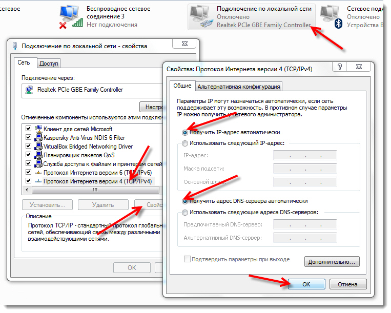 - Отыщите протокол TCP IPv4. Выделите и кликните по свойствам параметра. В новом окне поставьте автоматическую передачу информации.