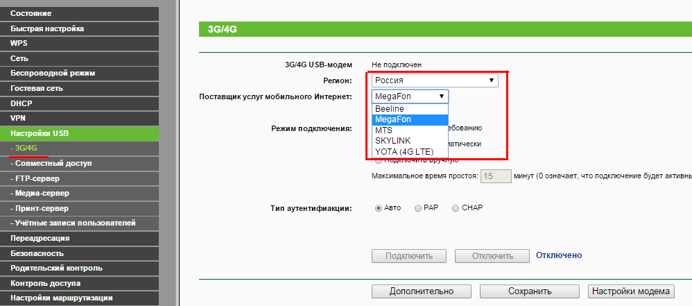 - В некоторые роутеры, например, в TP-Link, уже встроены настройки интернета для разных популярных сотовых операторов. В этом случае в меню «Поставщик услуг» достаточно выбрать свою компанию и сохранить изменения.