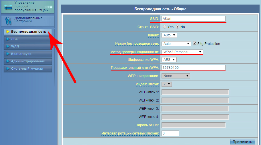- Теперь настройте саму сеть роутера. Зайдите в пункт «Беспроводная сеть» или «Вай-Фай». Поменяйте, если нужно, SSID (название точки). Поставьте защиту WPA2 Personal и напишите ниже сложный пароль. Запишите и запомните его. Его вы будете вводить при входе в свой «Вай-Фай» на всех устройствах. Сохраните все настройки.