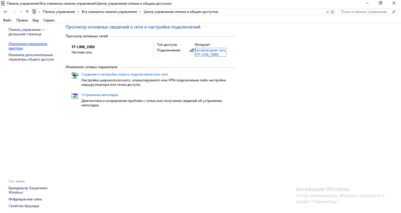 - Если подключились по кабелю, зайдите в «Панель управления» на ПК. Раскройте «Центр управления сетью».