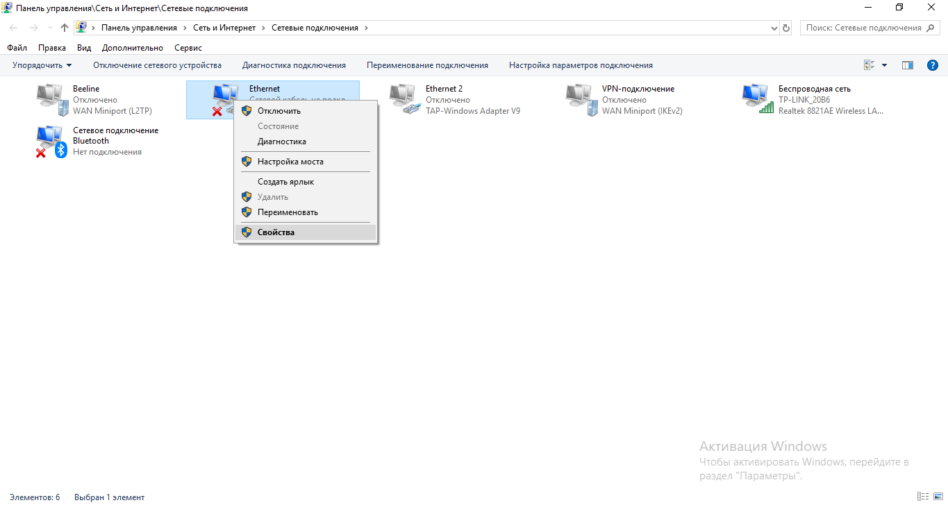 - Кликните правой клавишей мышки по локальному соединению или по Ethernet. Щёлкните по свойствам.