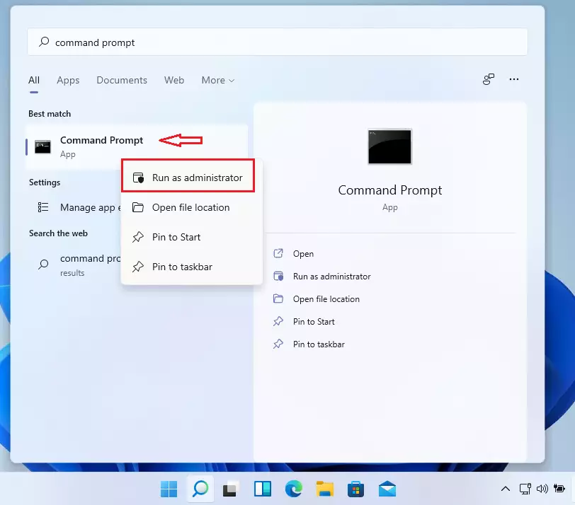 Чтобы создать резервную копию Linux в WSL, перейдите в меню «Пуск» в Windows, затем найдите и откройте командную строку от имени администратора.