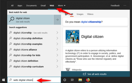 Поиск Windows 10 также может искать результаты в Интернете. Откройте поиск и нажмите или коснитесь кнопки «Интернет» или введите «Интернет», а затем то, что вы хотите найти в Интернете. Веб-результаты, которые вы получаете, могут сильно различаться: вы можете получать быстрые ответы, новости, веб-сайты, определения слов и так далее.
