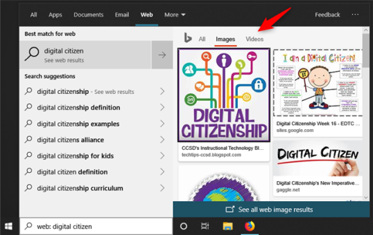Стоит отметить, что Bing включает результаты поиска. Кроме того, вы можете дополнительно отфильтровать результаты, нажав на ссылку Изображения или Видео в верхней части панели предварительного просмотра.