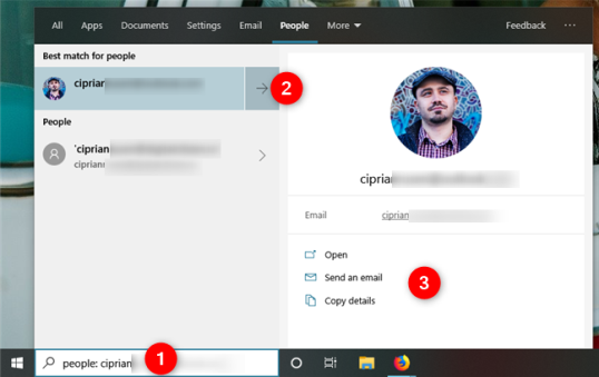 Windows 10 также может искать контакты, найденные в вашей адресной книге, в приложении «Люди». Если вы хотите выполнить такой поиск, нажмите или коснитесь Больше, а затем Люди или введите людей: в поле поиска на панели задач. Затем начните писать имя человека, которого вы ищете. После того, как результаты показаны, выберите интересующий вас контакт: на панели предварительного просмотра вы сможете увидеть фотографию этого человека, контактные данные и несколько ссылок для таких вещей, как отправка электронных писем или копирование его или ее данных, что обычно означает адрес электронной почты.