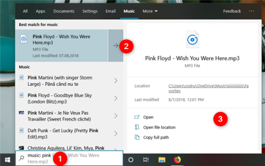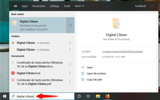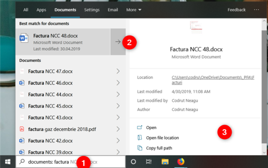 Приятной особенностью поиска является то, что Windows 10 может искать документы как в File Explorer, локально, так и в OneDrive. Вы можете открыть любой документ, который вы нашли, используя его приложение по умолчанию, а также открыть его местоположение или скопировать его путь.