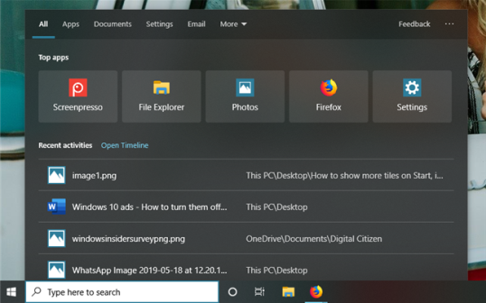 Если вам не нужно фильтровать результаты поиска с самого начала, или если вы хотите найти все, что соответствует вашим ключевым словам, вы должны знать, что вы можете начать печатать то, что вы ищете. Это может быть что угодно: приложение, настройка, документ, видео и т.д. Windows 10 сразу начинает искать все, что соответствует вашим условиям поиска, фильтруя результаты по мере их обнаружения.