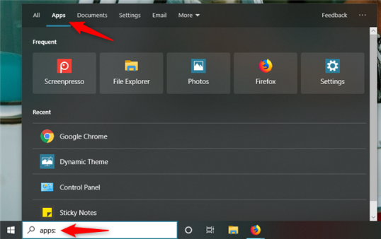 Открыв домашний экран поиска, щелкнув или нажав поле поиска на панели задач, вы можете отфильтровать поиск с самого начала, чтобы показывать только приложения. Нажмите или коснитесь кнопки «Приложения» в верхней части окна поиска или введите «Приложения» в поле поиска. Затем начните писать название приложения, которое вы ищете.
