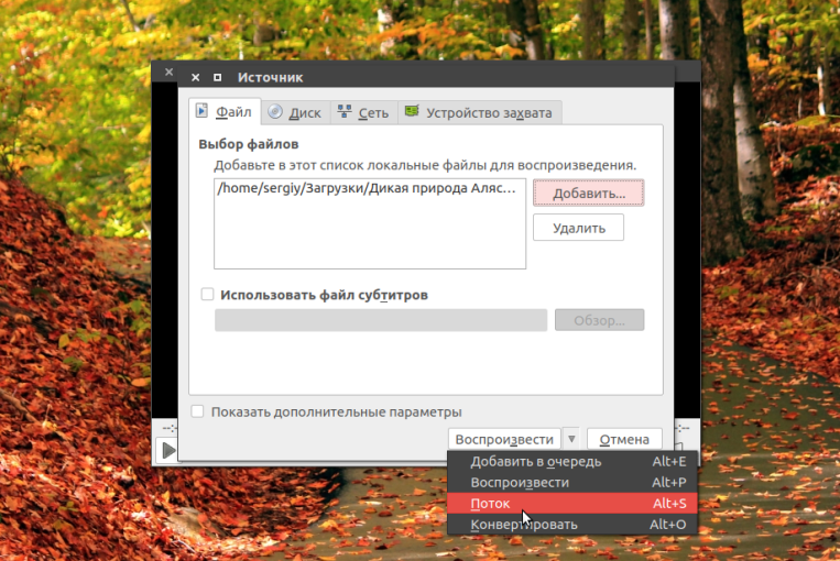 Затем перейдите на вкладку Файл, и выберите файл, который вы собираетесь транслировать с помощью кнопки Добавить: