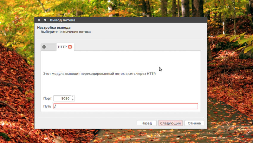 Затем нужно выбрать способы вещания в сеть. В строчке Новое назначение выберите HTTP. Затем выберите порт и url по которому будет открываться поток. Данные лучше оставить по умолчанию: