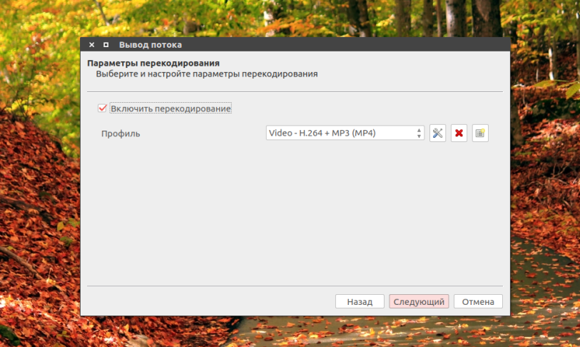 На следующей вкладке отметьте Включить перекодирование, в строчке профиль выберите Video — H.264 +MP3 (MP4):
