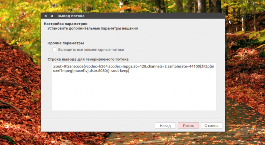 В следующем окне вы можете настроить различные параметры ffmpeg для потока если это нужно, затем осталось нажать кнопку Поток, чтобы запустить вещание: