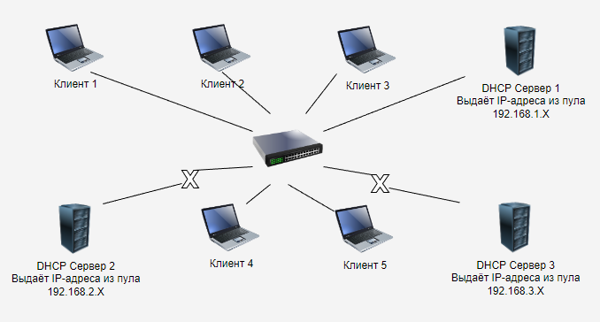 При этом, каждый компьютер может получить сетевые настройки от любого DHCP сервера. Эти настройки не согласованы друг с другом. Клиенты перестают видеть друг друга в сети. Некоторые клиенты теряют доступ к интернету. В общем — проблема за проблемой.