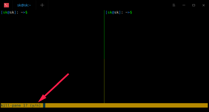 Чтобы убить панель, просто введите команду exit и нажмите клавишу ВВОД. Или нажмите Ctrl + b и x . Вы увидите подтверждающее сообщение. Просто нажмите «y», чтобы закрыть панель.