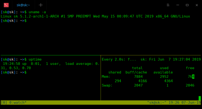 Сначала я сделал горизонтальное разделение, нажав Ctrl + b «, а затем разделил нижнюю панель по вертикали, нажав Ctrl + b% .
