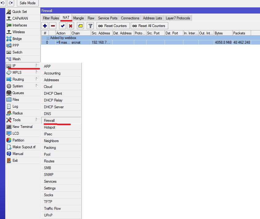 Для начала подключитесь к Mikrotik через winbox. Затем перейдите на вкладку IP-Firewall-NAT