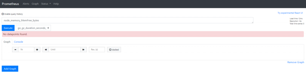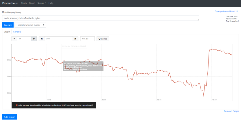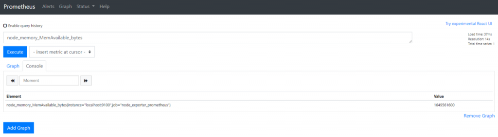 Консольный выход node_memory_MemAvailable_bytes. Нажимаем клавишу Execute —>затем вкладку Graph: