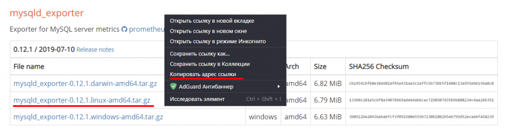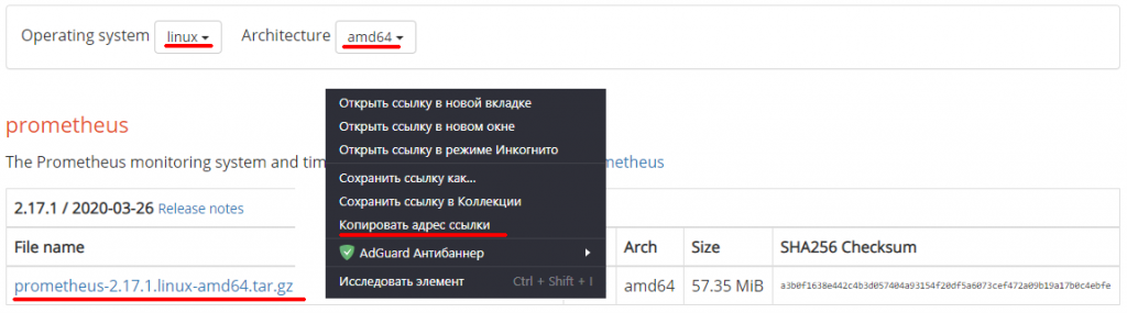 Зайдем на страничку разработчика системы Prometheus и скопируем ссылку на скачивание архива с программой: