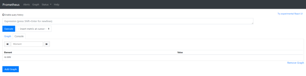 Вы можете щелкнуть Graph и запросить любые метрики сервера, а затем нажать кнопку выполнить, чтобы показать выходные данные. Он покажет вывод консоли.