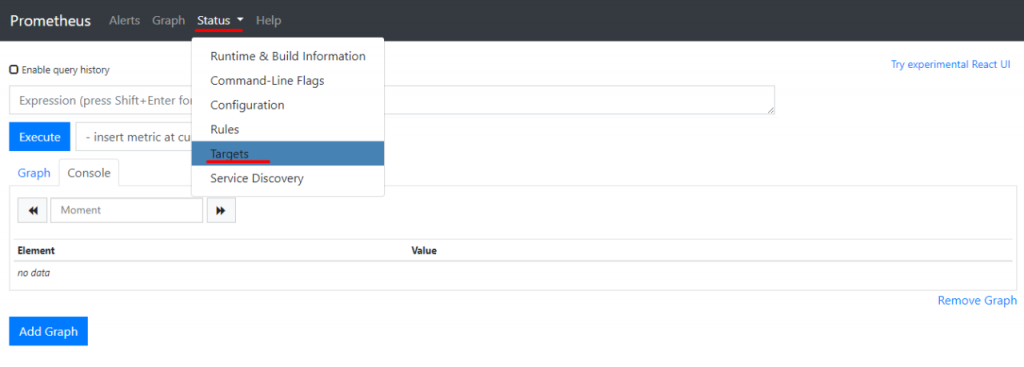 Для начала проверьте статус Prometheus и Node Explorer, открыв меню Status в верхней части экрана, а затем выбрав Targets.