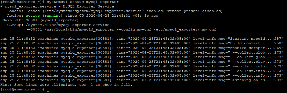 Здесь вы увидите состояние MySQL Exporter, основной идентификатор процесса (PID), использование памяти и так далее.