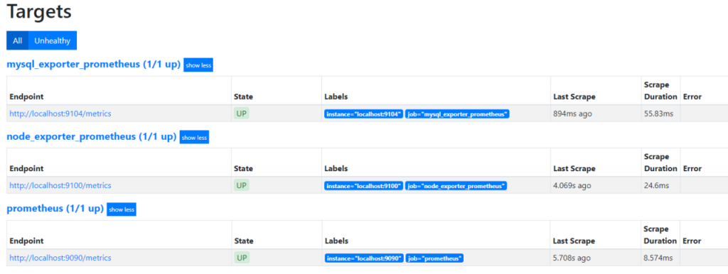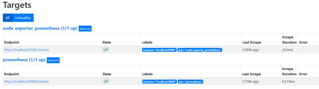 Поскольку Prometheus собирает и свои данные и другие метрики, в состоянии UP вы должны увидеть все цели, которые ему ставили.
