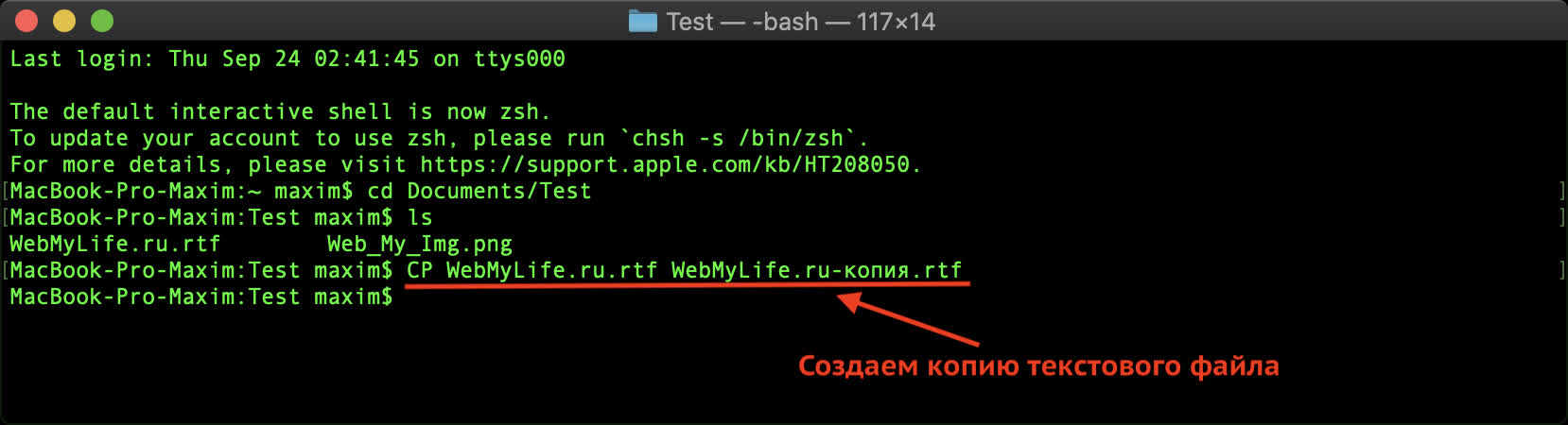 Теперь давайте сделаем копию нашего текстового файла. Для этого используем команду cp. Введите CP WebMyLife.ru.rtf WebMyLife.ru-копия.rtf.