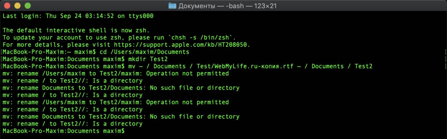 - Затем введите mv ~ / Documents / Test/WebMyLife.ru-копия.rtf ~ / Documents / Test2 для перемещения из первого каталога во второй.