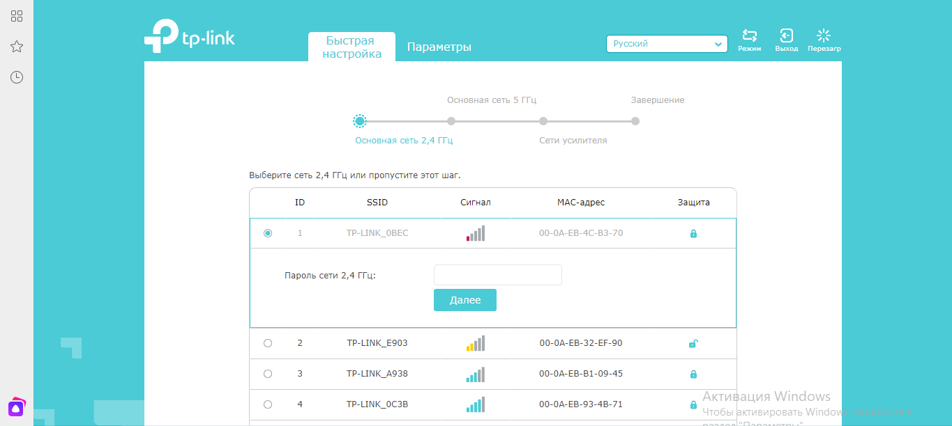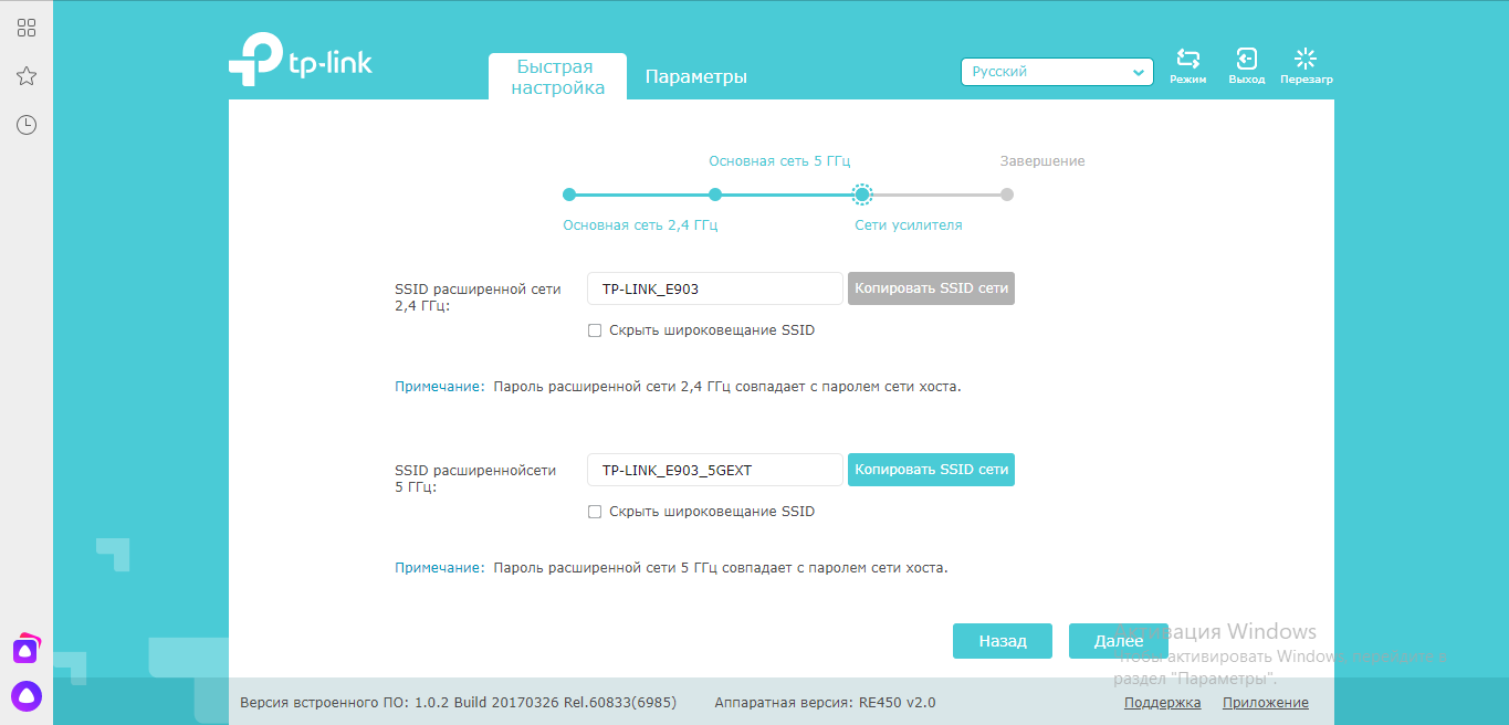 - Введите название точек доступа — для 2.4 и 5 ГГц. С помощью кнопки справа можете просто скопировать SSID вашего роутера. С помощью пункта под названием точки доступа вы можете скрыть сеть репитера от посторонних. Нажмите на «Далее».