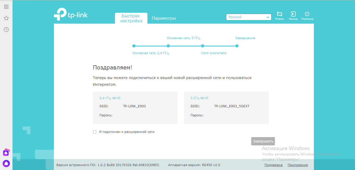 - Подождите, пока роутер и репитер соединятся, и нажмите на «Завершить». Проверьте скорость работы репитера.