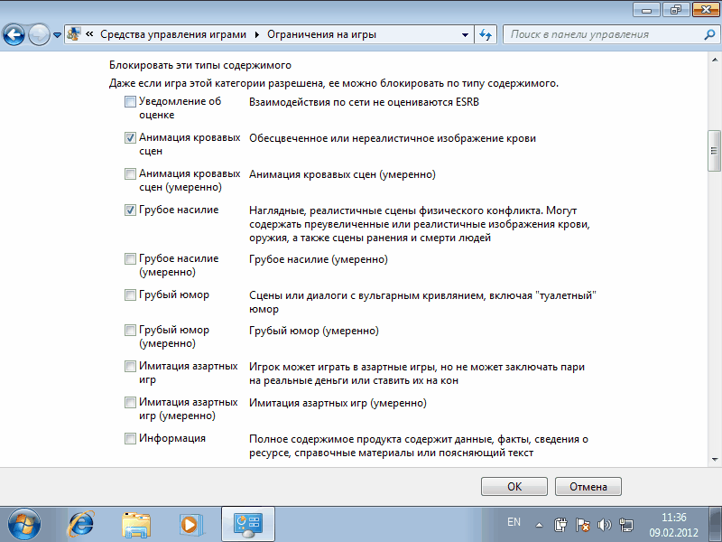 Здесь же можем задать ограничения более детально, по типам содержимого. Например, запретим игры, содержащие сцены насилияограничение по типам содержимого