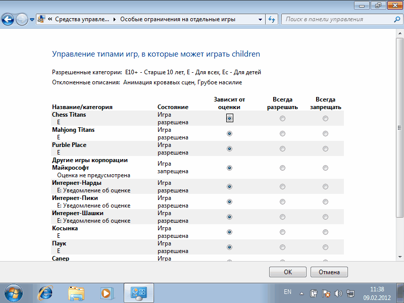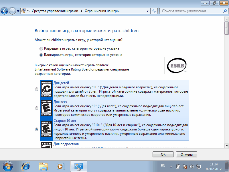 На эту настройку не стоит возлагать больших надежд, рейтинг ESRB, по которому они выбираются, содержит только англоязычные игры. Также не отслеживаются on-line игры, запускаемые в браузере. Однако мы можем вручную задать ограничения на игры, которые установлены на компьютере.