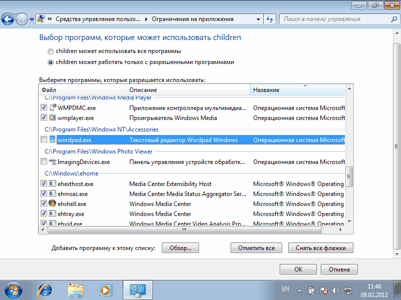 Настроим программы, которые нашему ребенку будет позволено запускать на компьютере. Обратите внимание, что отмечать нужно те программы, которые мы запрещаем. Если какой то программы нет в списке, можно добавить ее вручную. Для этого щелкаем по кнопке «Обзор» и находим папку с установленной программой.родительский контроль