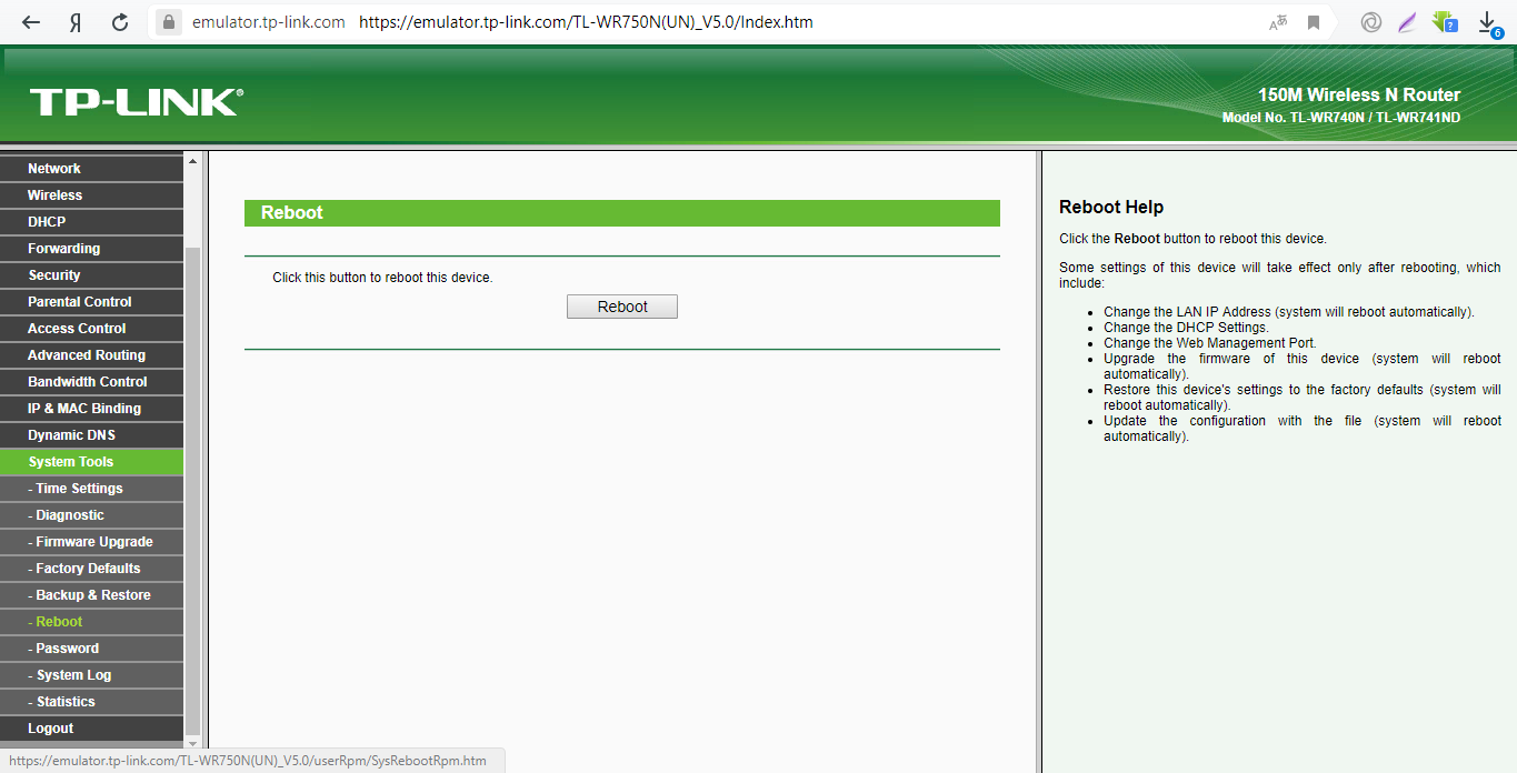 Перезапуск возможен и через веб-оболочку роутера: зайдите в System Tools, во вкладку Reboot. Щёлкните по одноимённой кнопке в разделе и подождите, пока устройство выключится и включится опять.